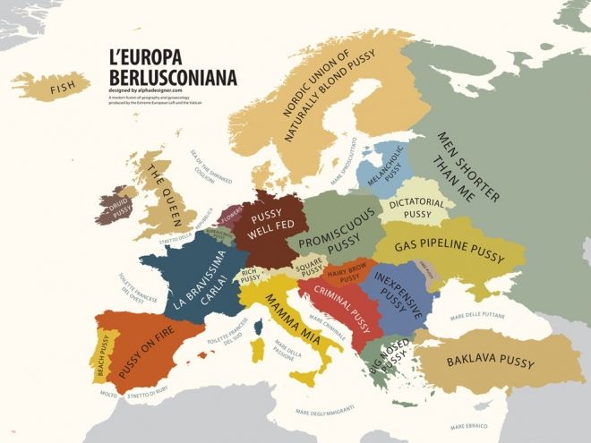 To φαινόμενο Σίλβιο Μπερλουσκόνι δεν θα μπορούσε να ξεφύγει απο τη σάτιρα και έτσι μαζί με τα εθνικά στερεότυπα παρακάτω παρουσιάζεται η «Europa Berlusconiana» στην οποία ο Ιταλός πρωθυπουργός βλέπει μόνο σεξ και γυναίκες!
