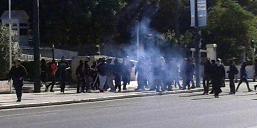 Ομάδα κουκουλοφόρων νεαρών άρχισε να χτυπά με ξύλα και πέτρες την πρόσοψη υποκαταστήματος τράπεζας στην οδό Όθωνος στην πλατεία Συντάγματος, ενώ λίγο αργότερα εκτόξευσαν πέτρες στην πλατεία Συντάγματος, αλλά και προς τη Βουλή.