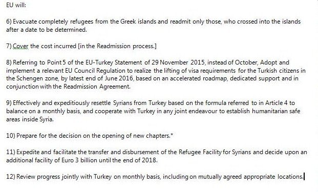 Επιπλέον, σύμφωνα με το προσχέδιο, η ΕΕ θα δώσει άλλα 3 δισ. ευρώ- όπως ζητούσε η Αγκυρα- έως το τέλος του 2018 για να βοηθήσει την Τουρκία να φιλοξενήσει τους Σύρους, διπλασιάζοντας την αρχική προσφορά της. Επιπλέον, θα διευκολύνει τη διαδικασία βίζα για τους Τούρκους που θέλουν να επισκεφθούν τη ζώνη Σένγκεν, έως τα τέλη Ιουνίου, δηλαδή νωρίτερα από ότι είχε σχεδιαστεί.