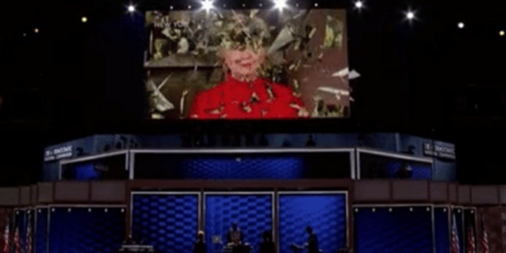 Πριν την έναρξη της ομιλίας αυτής που είχε στοιχεία ιδιαίτερα προβλήθηκε ένα βίντεο με μια δυνατή στιγμή: Ενώ παρουσιάζονταν φωτογραφίες προηγούμενων ανδρών Προέδρων της Αμερικής σπάει το γυαλί και εμφανίζεται η Χίλαρι Κλίντον.