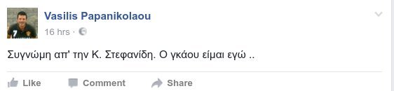 «Συγνώμη απ' την Κ. Στεφανίδη. Ο γκάου είμαι εγώ» έγραψε στην προσωπική του σελίδα, αφού προηγουμένως είχε κατεβάσει το αρχικό του ποστ στο οποίο αναφερόταν στις δηλώσεις Στεφανίδη για την εφημερίδα «Αυγή» αποκαλώντας την «γκάου».