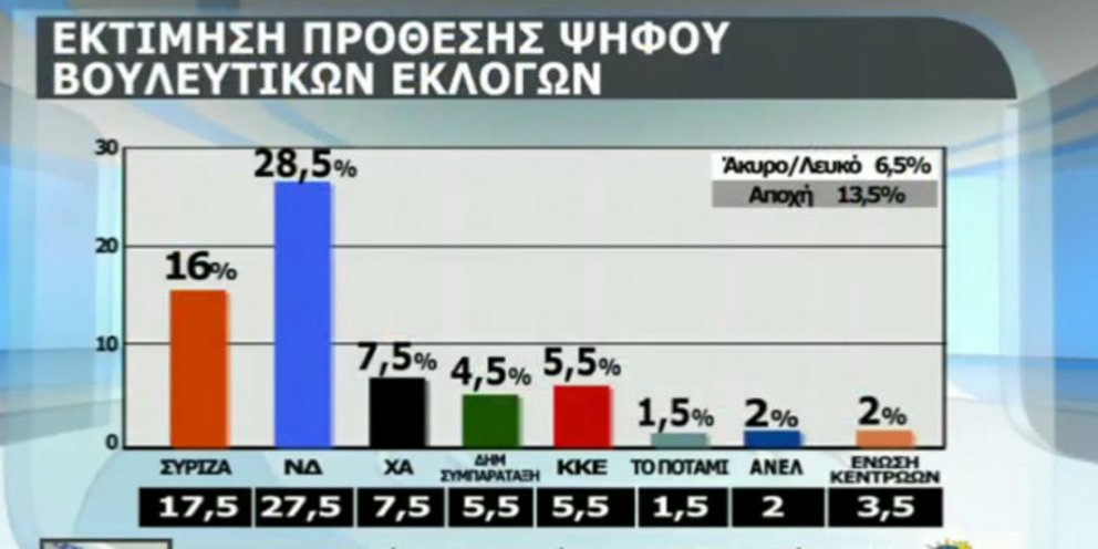 Στην πρόθεση ψήφου η ΝΔ συγκεντρώνει 28,5% (από 27,5%), ο ΣΥΡΙΖΑ 16% (από 17,5%). Ακολουθούν με 7,5% η ΧΑ, με 5,5% το ΚΚΕ και με 4,5% η Δημοκρατική Συμπαράταξη. Από 2% συγκεντρώνουν ΑΝΕΛ, Ένωση Κεντρώων, ΑΝΤΑΡΣΥΑ και Πλεύση Ελευθερίας, ενώ από 1,5% καταγράφουν Το Ποτάμι και η ΛΑΕ. Ποσοστό 6,5% δηλώνει ότι θα ψηφίσει άλλο κόμμα ενώ το 20,5% δηλώνει «δεν ξέρω/δεν απαντώ».