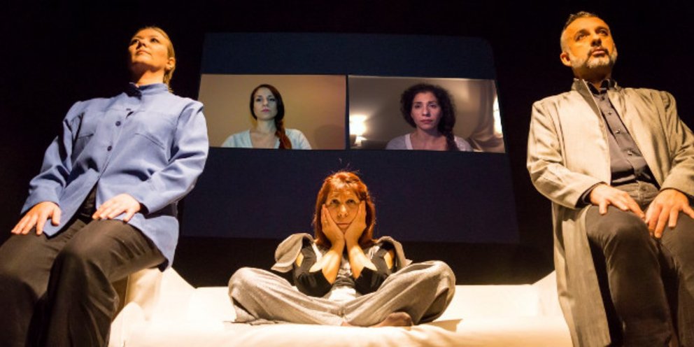 Στο έργο, η Ξένια συνδέεται μέσω skype με τη μετανάστρια Μελίνα.