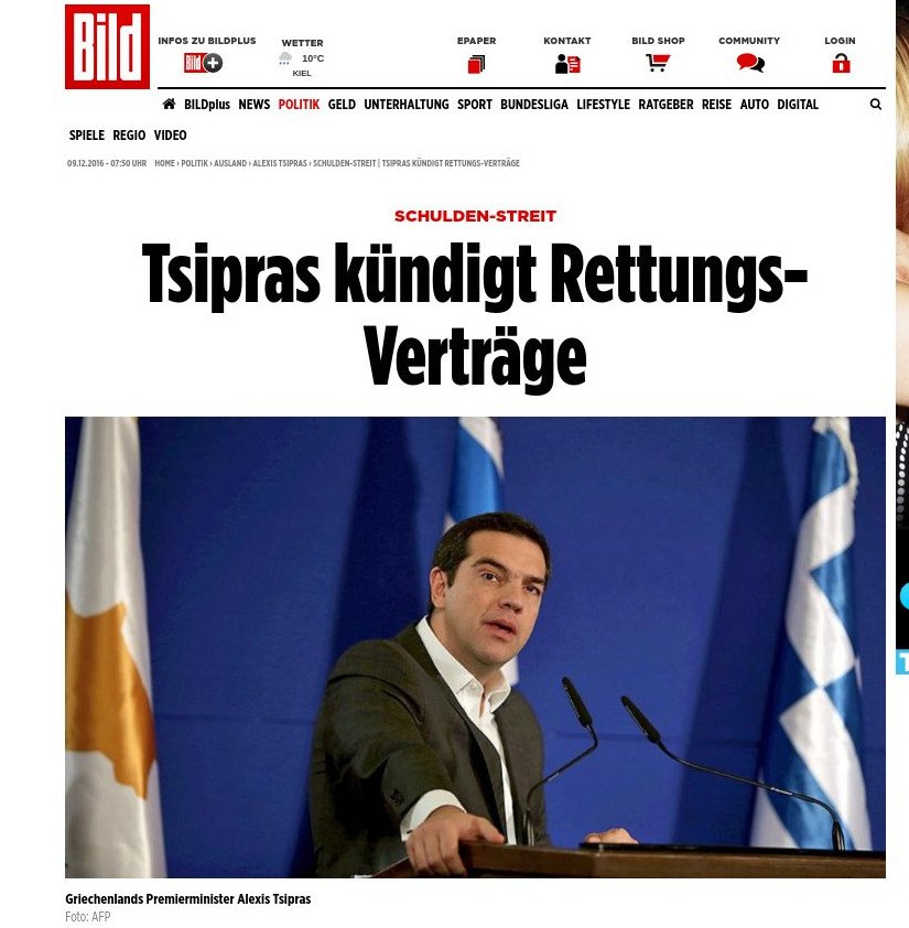 «Ο Ελληνας πρωθυπουργός Αλέξης Τσίπρας σπάει τις συμβάσεις για τα ευρω-προγράμματα βοήθειας», γράφει η ευρείας κυκλοφορίας γερμανική εφημερίδα Bild.