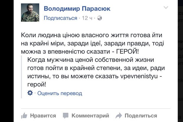 Ο εθνικιστής βουλευτής, για τον οποίον υπάρχουν υποψίες ότι διέπραξε εγκλήματα πολέμου στη διάρκεια της εξέγερσης στο Κίεβο, ανάρτησε μια φωτογραφία του δράστη και έγραψε: «Όταν ένας άνδρας είναι έτοιμος, ακόμη και με κόστος τη ζωή του, να πάρει ακραία μέτρα για χάρη μιας ιδέας, για χάρη της αλήθειας, τότε μπορούμε με βεβαιότητα να πούμε ότι είναι ήρωας».