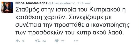 «Σταθμός στην ιστορία του Κυπριακού η κατάθεση χαρτών. Συνεχίζουμε με συνέπεια την προσπάθεια ικανοποίησης των προσδοκιών του κυπριακού λαού», ανέφερε στο μήνυμα του μετά την κατάθεση των χαρτών των δύο πλευρών ο Κύπριο πρόεδρος.