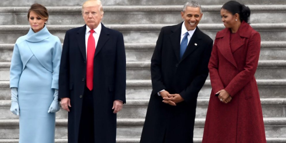 Από τη μια οι Ομπάμα που παρότι είναι πλέον πρώην (Πρόεδρος και Πρώτη Κυρία) στέκονται χαμογελαστοί, με τον Μπαράκ Ομπάμα να γέρνει προς την σύζυγό του και να επικοινωνούν με τον δικό τους τρόπο. Από την άλλη, οι Τραμπ αγέλαστοι και ανέκφραστοι στέκονται ο ένας δίπλα στον άλλον, σε απόλυτη προσοχή.