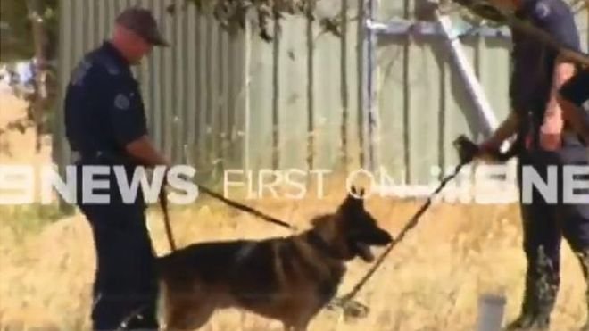 Σε εικόνες που μετέδωσε το τοπικό δίκτυο Nine αστυνομικοί με σκυλιά διακρίνονται να ερευνούν εξονυχιστικά μια ιδιοκτησία στο Γιανγκ, περίπου 150 χλμ βορειοδυτικά της Καμπέρα.