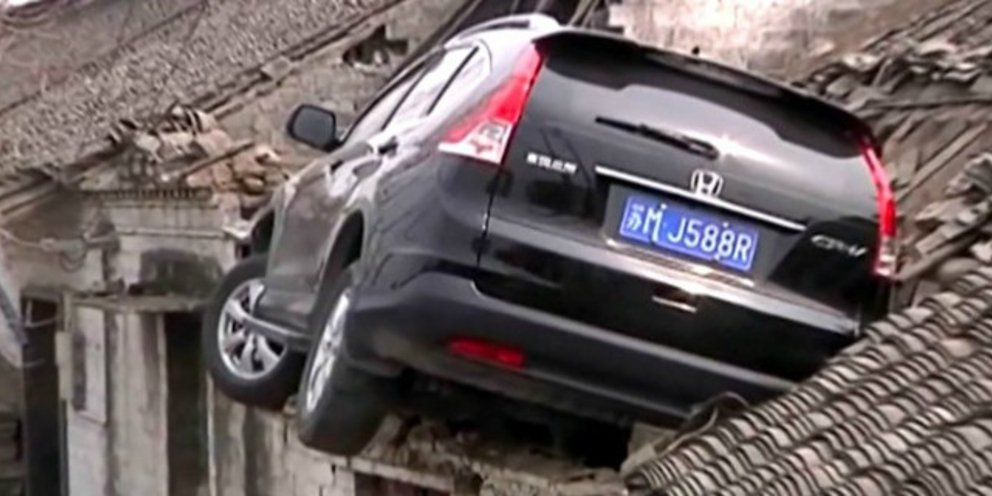 Το απίστευτο περιστατικό συνέβη στην πόλη Taizhou, στην επαρχία Jiangsu στην Κίνα, όταν ο οδηγός του SUV, στην προσπάθειά του να αποφύγει διερχόμενο όχημα κατά λάθος επιτάχυνε και βρέθηκε στη στέγη του σπιτιού. Ο ιδιοκτήτης του σπιτιού δήλωσε στην αστυνομία ότι άκουσε έναν δυνατό θόρυβο.
