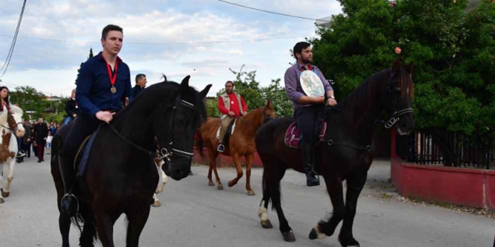 Καβαλάρηδες κρατούν πάνω στα άλογα εικόνες του Αη Γιώργη και μέσα σε κλίμα κατάνυξης ακολουθούν οι πιστοί.