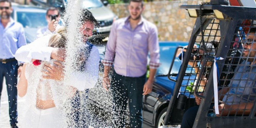 Οι εκπλήξεις δεν τελείωσαν εκεί αφού οι φίλοι του ζευγαριού μετά το μυστήριο τους έριξαν ρύζι αλλά με έναν διαφορετικό τρόπο. Το είχαν στοιβαγμένο σε... κλάρκ και μόλις το ζευγάρι βγήκε από την εκκλησία τους το έριξαν με τα... κιλά!