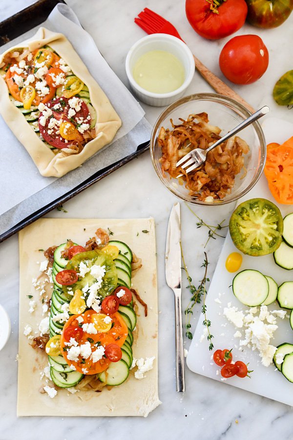 - Απλώστε τα καραμελωμένα κρεμμύδια στη ζύμη και μετά 2 σειρές κολοκυθάκια, αλατίστε -Συνεχίστε με τις ντομάτες και ντοματίνια, ρίξτε τη φέτα τριμμένη, θυμάρι, αλάτι και πιπέρι
