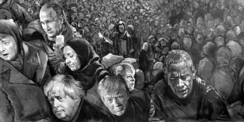 Σε έναν άλλο πίνακα, η ατελείωτη ουρά ανθρώπων που περιμένουν το συσσίτιο περιλαμβάνει τον πρωθυπουργό του Ισραήλ, τον πρόεδρο του Ιράν, αλλά και τον Μπαράκ Ομπάμα. Σε ένα ασπρόμαυρο έργο του, Μέρκελ, Ομπάμα, Τραμπ, Πούτιν, Ομπάμα, Μπόρις Τζόνσον και Τερέζα Μέι προχωρούν μαζί με αμέτρητους εξαθλιωμένους πρόσφυγες.