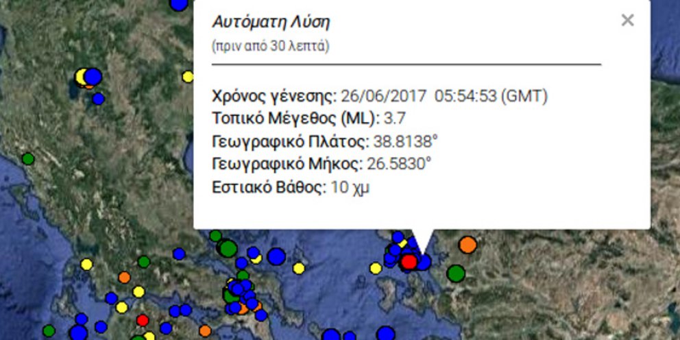Σεισμική δόνηση 3,7 βαθμών της κλίμακας Ρίχτερ, σύμφωνα με το Γεωδυναμικό Ινστιτούτο Αθηνών, με επίκεντρο 33 χιλιόμετρα νότια της Μυτιλήνης στις 8 και 54 σήμερα το πρωί Δευτέρα 26 Ιουνίου. Η σεισμική δόνηση έγινε ιδιαίτερα αντιληπτή.