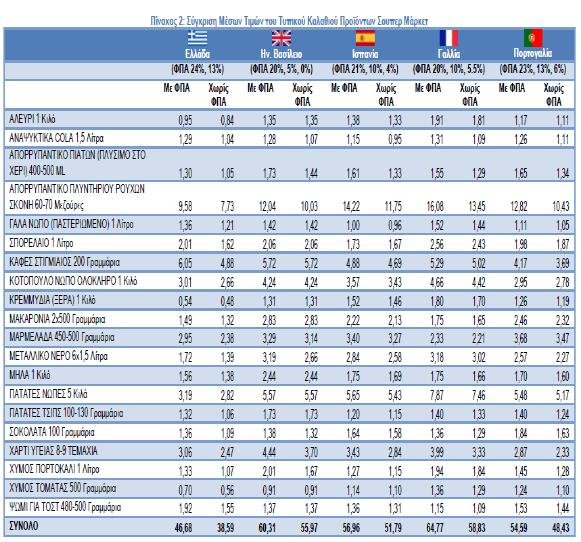 Χαμηλότερες παραμένουν οι τιμές ενός τυπικού καλαθιού σούπερ μάρκετ στην Ελλάδα σε σχέση με την Αγγλία, τη Γαλλία, την Ισπανία και την Πορτογαλία, παρά το γεγονός ότι η χώρα μας έχει τον υψηλότερο ΦΠΑ σε τρόφιμα και ποτά.