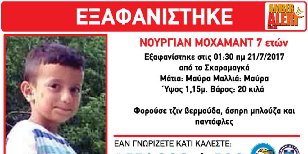 Σύμφωνα με το Χαμόγελο του Παιδιού, στις 21/07/2017 και ώρα 01:30, εξαφανίστηκε από Κέντρο Φιλοξενίας στο Σκαραμαγκά, ο Νουργιάν Μοχαμάντ, 7 ετών. Ο Νουργιάν έχει μαύρα μαλλιά, μαύρα μάτια, ύψος 1,15 μ. και ζυγίζει 20 κιλά. Φορούσε τζιν βερμούδα, άσπρη μπλούζα και παντόφλες.