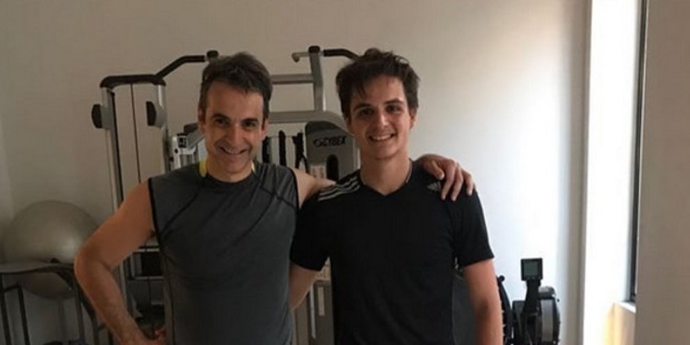 Η φωτογραφία δείχνει τον πρόεδρο της ΝΔ και τον Κωνσταντίνο Μητσοτάκη στο γυμναστήριο.