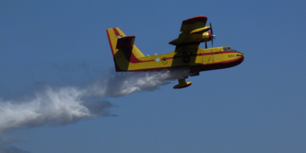 Επίσης, από αέρος πραγματοποιούν ρίψεις νερού ένα πυροσβεστικό αεροπλάνο, τύπου «Καναντέρ και τέσσερα ακόμη, τύπου «Πετζετέλ».