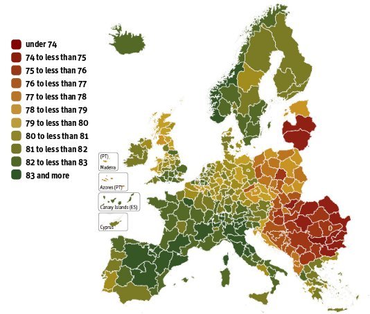 Περισσότερο από όλους στην Ευρώπη ζουν οι άνθρωποι στη βόρεια Ιταλία, στη βόρεια Ισπανία, στις παράκτιες περιοχές της Γαλλίας, καθώς και σε τμήματα της Ελβετίας και της Νορβηγίας. Τις πιο σύντομες ζωές έχουν οι άνθρωποι στην ανατολική Ευρώπη, με χειρότερες τη Λιθουανία και τη Βουλγαρία.