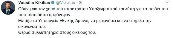 Ο βουλευτής και τομεάρχης της ΝΔ Βασίλης Κικίλιας εξέφρασε την οδύνη του και κάλεσε το υπουργείο Εθνικής Αμυνας να στηρίξει την οικογένειά του: