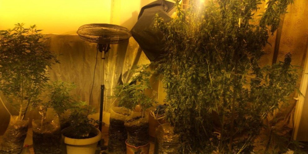 Αυτοσχέδιο εργαστήριο υδροπονικής καλλιέργειας κάνναβης, αποτελούμενο από αυτοσχέδιο σκέπαστρο, ηλεκτρικούς ανεμιστήρες, λαμπτήρες πυρακτώσεως, αφυγραντήρα και θερμόμετρο,