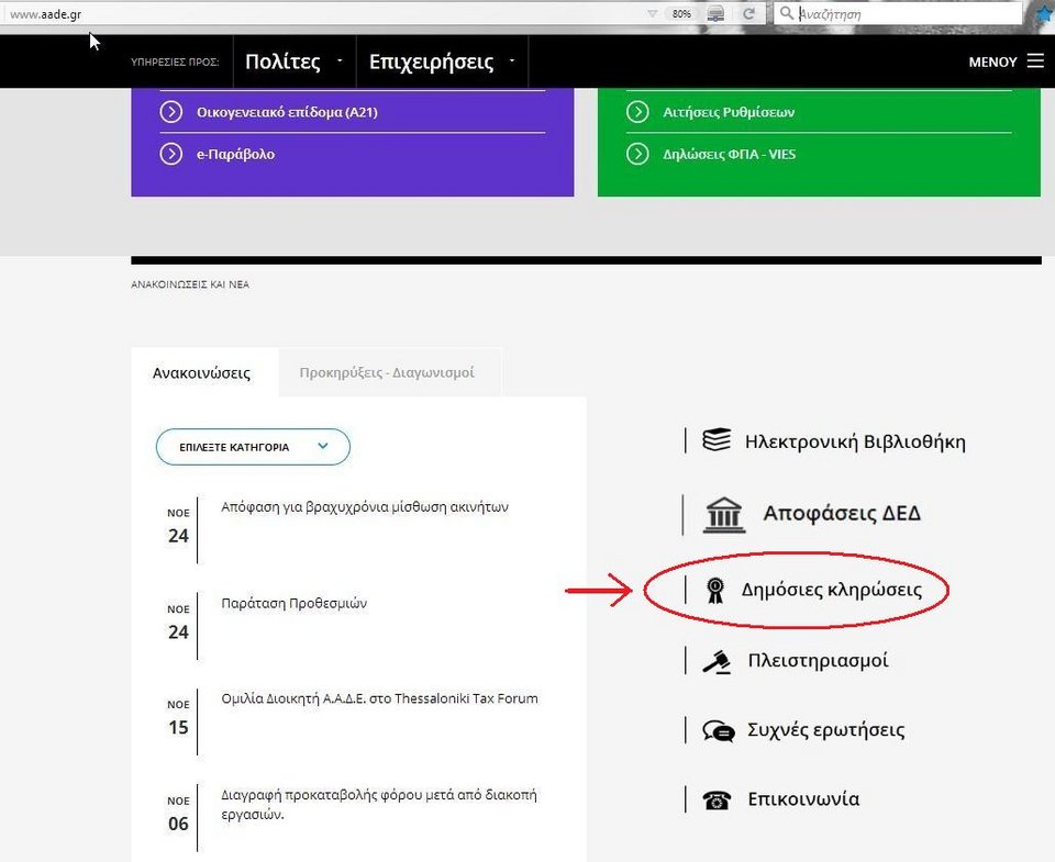 Επισκέπτεσθε τη σχετική εφαρμογή (ΠΡΟΓΡΑΜΜΑ ΔΗΜΟΣΙΩΝ ΚΛΗΡΩΣΕΩΝ) στο δικτυακό τόπο της Α.Α.Δ.Ε., με χρήση των προσωπικών κωδικών σας πρόσβασης στο TAXISnet.