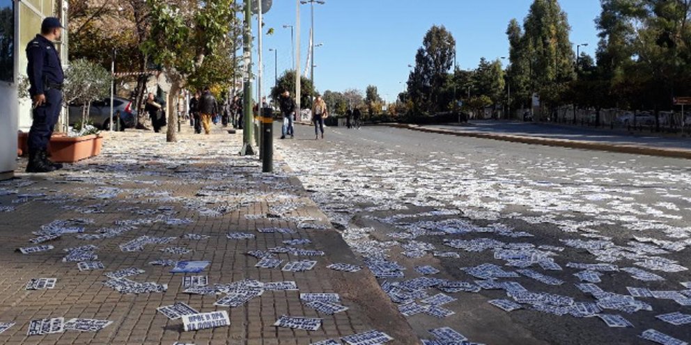 Την στιγμή που η πομπή με τον Τούρκο Πρόεδρο Ταγίπ Ερντογάν περνούσε από την Μεσογείων, χρυσαυγίτες βγήκαν στο μπαλκόνι των γραφείων τους και πέταξαν φυλλάδια με εθνικιστικό περιεχόμενο.