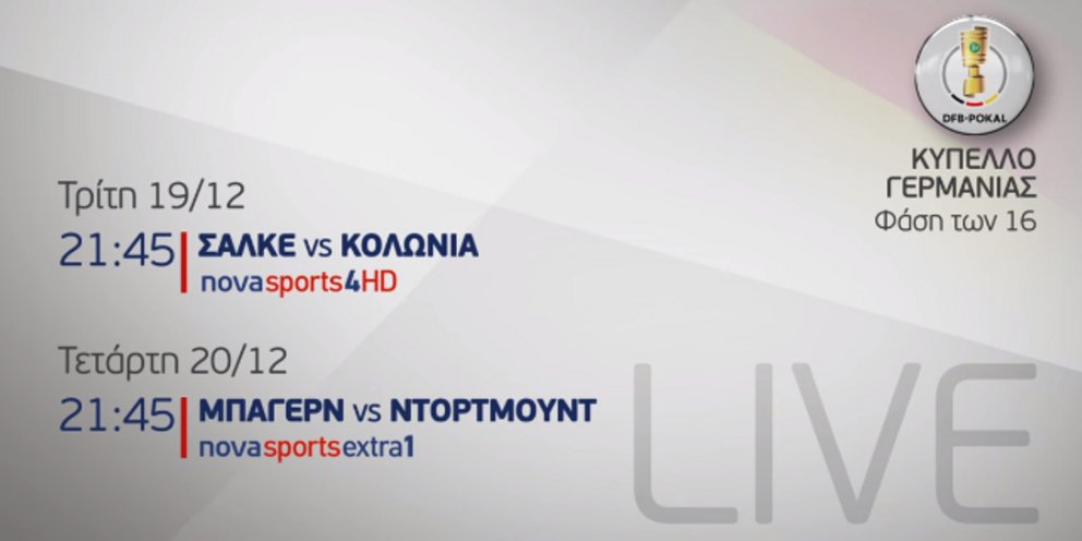 Οι συνδρομητές των αθλητικών καναλιών της Nova, από την Τρίτη 19 Δεκεμβρίου έως και την Κυριακή 24 Δεκεμβρίου, θα έχουν την ευκαιρία να παρακολουθήσουν ζωντανά και αποκλειστικά τους νοκ άουτ αγώνες Σάλκε – Κολωνία και Μπάγερν – Ντόρτμουντ για την φάση των «16» του Κυπέλλου Γερμανίας, αλλά και τα νοκ άουτ παιχνίδια Νάπολι – Ουντινέζε, Ρόμα - Τορίνο και Γιουβέντους – Τζένοα για την φάση των «16» του Κυπέλλου Ιταλίας.