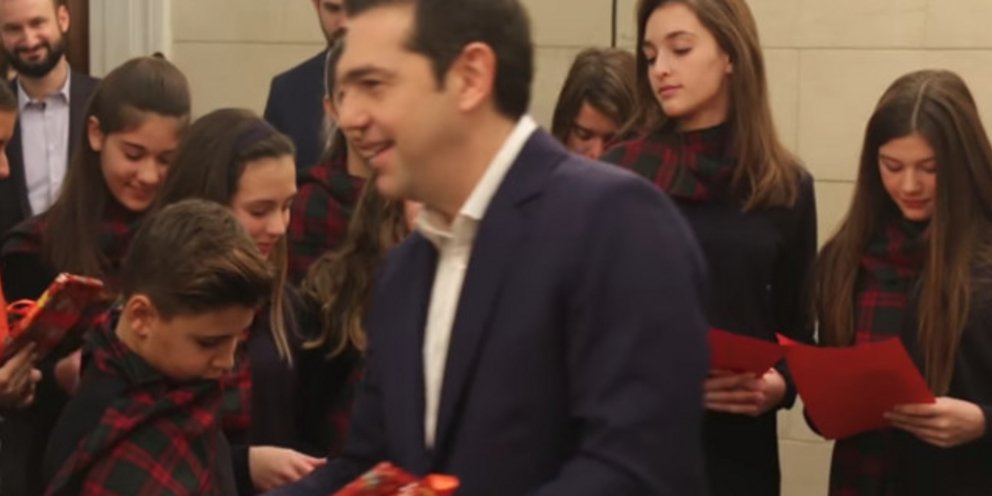 Αυτές είναι οι φράσεις που αναγράφονται στις λεζάντες του βίντεο ενώ προβάλλονται πλάνα από τα παιδιά που πήγαν χθες να πουν τα κάλαντα στο Μαξίμου και τα δώρα που τους μοίρασε ο Αλέξης Τσίπρας.