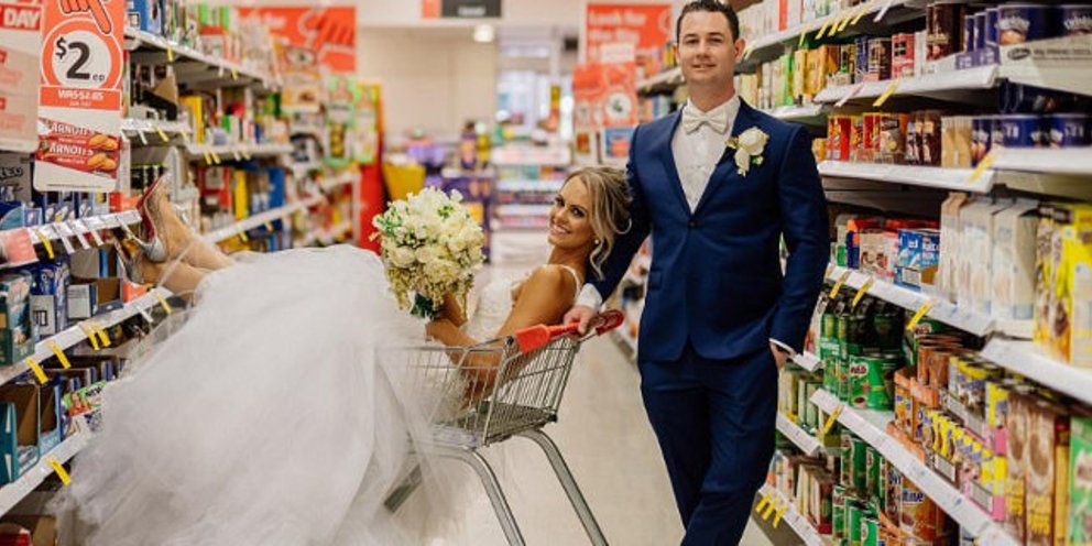 Με την νύφη να κρατά για ανθοδέσμη ένα μπρόκολο και τον γαμπρό να την κάνει βόλτες σε ένα καροτσάκι για τα ψώνια, το ζευγάρι φαίνεται να το διασκέδασε όσο τίποτα άλλο.