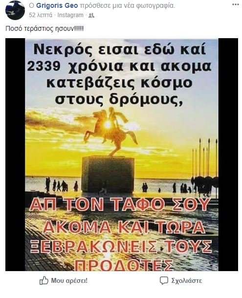 Μετά τον Βασίλη Τσιάρτα και ο Γρηγόρης Γεωργάτος πήρε θέση για το συλλαλητήριο. Συγκεκριμένα έβαλε μία φωτογραφία με το άγαλμα του Μεγάλου Αλεξάνδρου στη Θεσσαλονίκη, γράφοντας: