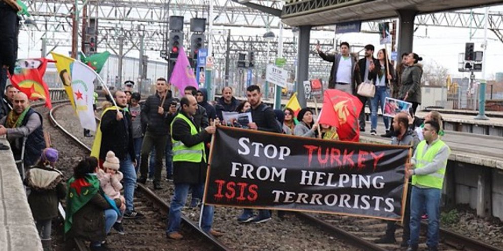 Σε βίντεο που μετέδωσαν βρετανικοί ιστότοποι διακρίνονται οι διαδηλωτές να κατεβαίνουν στις ράγες. Κρατούσαν σημαίες της κουρδικής πολιτοφυλακής Μονάδες Προστασίας του Λαού (YPG) και φωτογραφίες του Αμπντουλάχ Οτσαλάν, του φυλακισμένου ηγέτη του PKK.