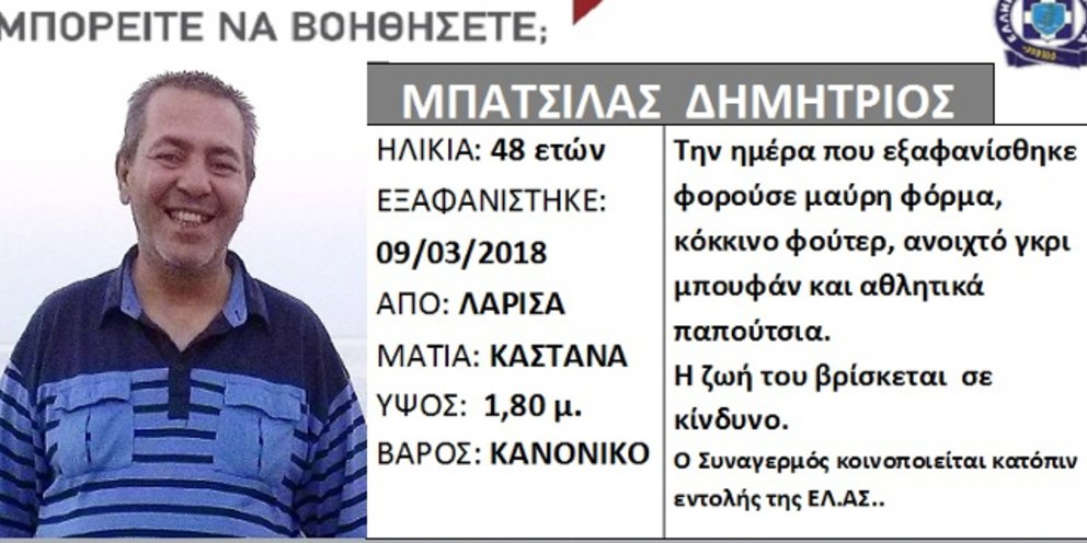 Ο 48χρονος άνδρας ονομάζεται Δημήτρης Μπατσίλας και αγνοείται από το βράδυ της Παρασκευής 9 Μαρτίου. Ο άνδρας έχει ύψος 1,80 και αντιμετωπίζει προβλήματα υγείας.