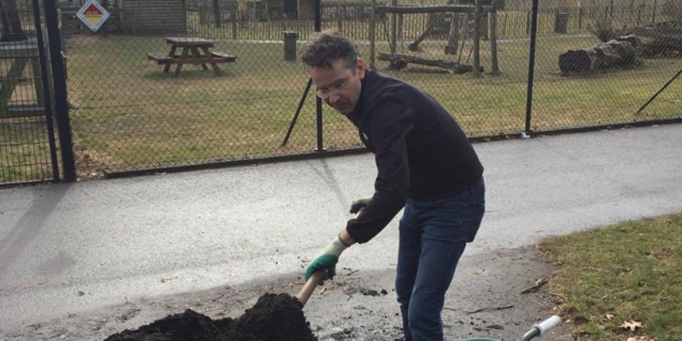Ο πρώην επικεφαλής του Eurogroup φορά τζιν, γάντια και με ένα φτυάρι μαζεύει κοπριά σε ένα καρότσι.