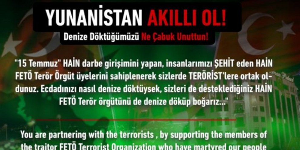 Οι Τούρκοι χάκερ κατηγορούν την Ελλάδα ότι συμπράττει με τους πραξικοπηματίες και απειλούν και πάλι να μας «ρίξουν όλους στην θάλασσα όπως έκαναν και με τους προγόνους».