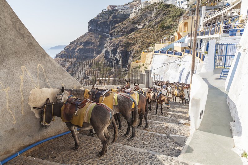 Κάθε μέρα, τα γαϊδουράκια της Σαντορίνης θα κάνουν τέσσερις με πέντε φορές τη διαδρομή με τα 520 σκαλιά ακολουθώντας το μονοπάτι που οδηγεί στην πόλη των Φηρών και τα γραφικά ασβεστωμένα κτίρια. Η πρακτική αυτή με τα γαϊδουράκια συνεχίζεται εδώ και δεκαετίες.