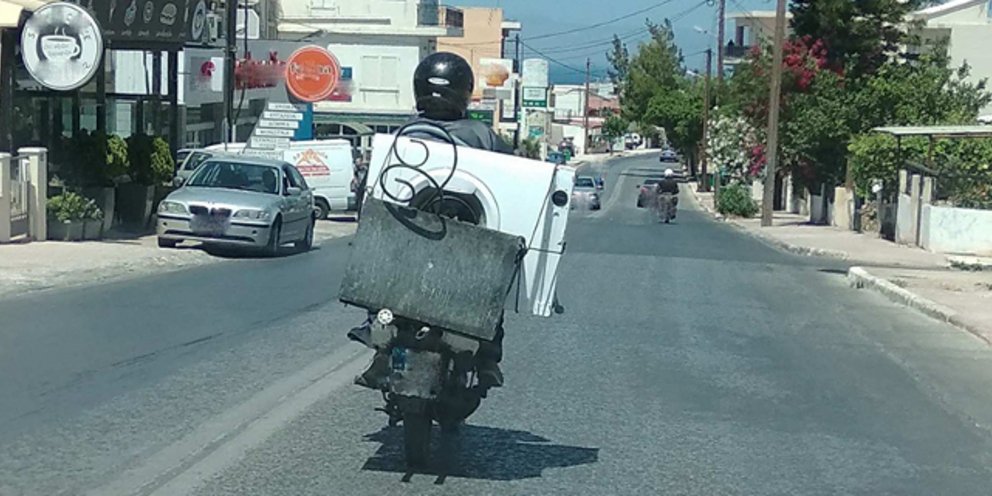 Ο οδηγός του δικύκλου που βλέπετε στη φωτογραφία του zarpanews.gr, είχε την ασύλληπτη ιδέα να φορτώσει πάνω στο δίκυκλό του… ένα πλυντήριο!