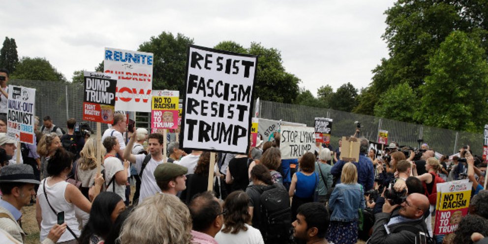 Στα πλακάτ που κρατούσαν οι συμμετέχοντες, αναγράφονταν συνθήματα όπως «Τραμπ, μια ειδική σχέση; Πείτε απλά όχι», «Σταμάτα να λες ψέματα».