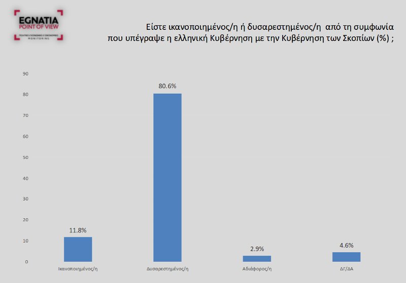 Συντριπτικά κατά της συμφωνίας που υπέγραψε η κυβέρνηση με την ΠΓΔΜ στις Πρέσπες είναι τα ποσοστό του Πολιτικού Βαρόμετρου: Το 80,6% δηλώνει δυσαρεστημένο από τη Συμφωνία, το 11,8% ικανοποιημένο και το 7,5% δηλώνει είτε αδιάφορο είτε πως δεν γνωρίζει. Τα μεγαλύτερα ποσοστά δυσαρέσκειας εμφανίζονται στην Κεντρική Μακεδονία με 84%, ακολούθως στην Ανατολική Μακεδονία Θράκη με 79,2% και μετά σε Δυτική Μακεδονία – Ήπειρο με 74,8%.
