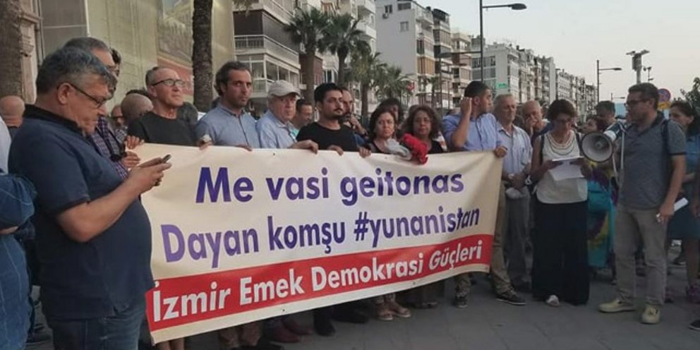 «Κρατάτε γείτονες» έλεγαν τα πανό, αντιγράφοντας τον τίτλο της Ελευθεροτυπίας στις 17.8.1999, όταν ο τουρκικός λαός δοκιμαζόταν τότε από τον ισχυρό σεισμό.
