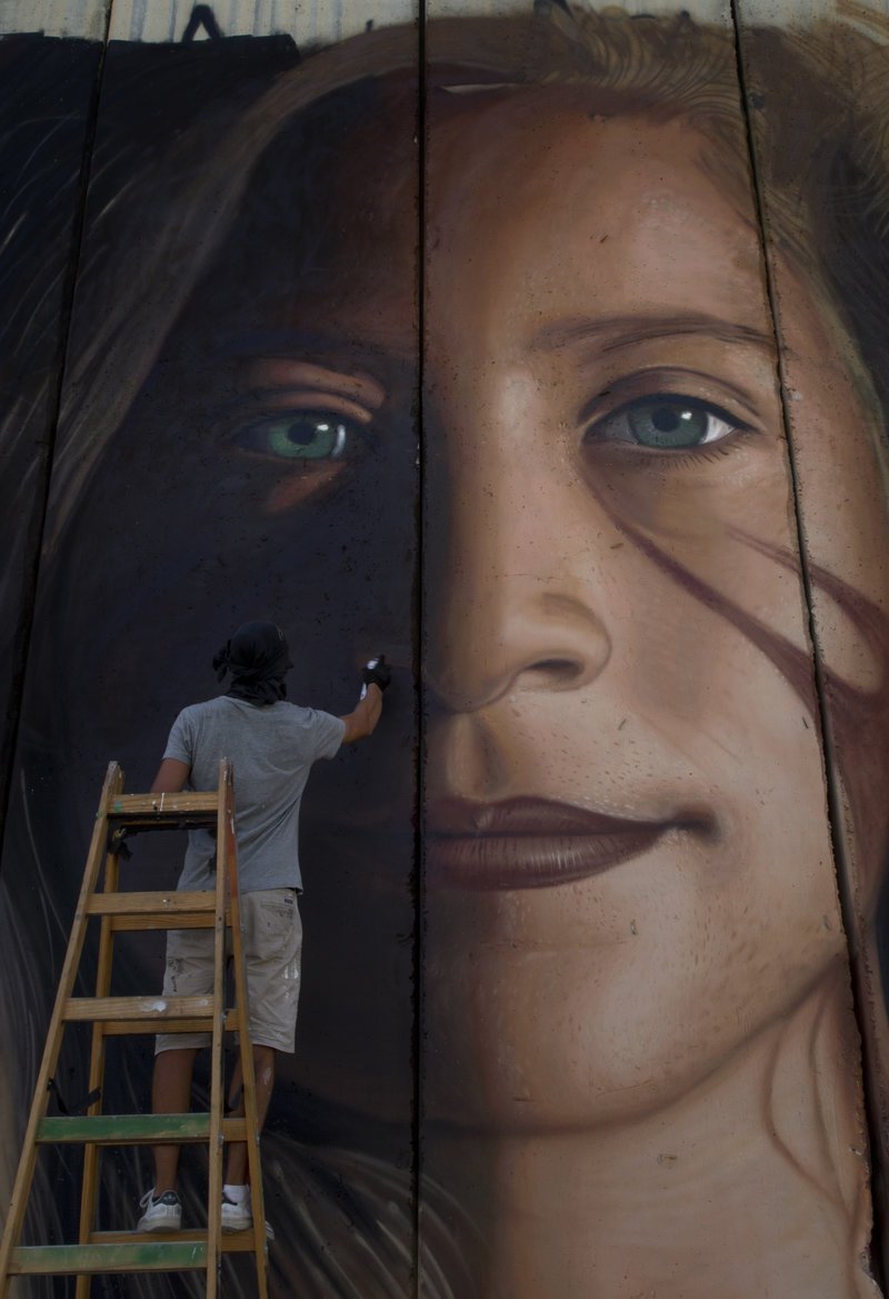 Το γκραφίτι ύψους σχεδόν τεσσάρων μέτρων εικονίζει το διάσημο πλέον πρόσωπο της 17χρονης Παλαιστίνιας που πέρασε οκτώ μήνες σε ισραηλινή φυλακή διότι χειροδίκησε εναντίον δύο ισραηλινών στρατιωτών στην αυλή του σπιτιού της οικογένειάς της.