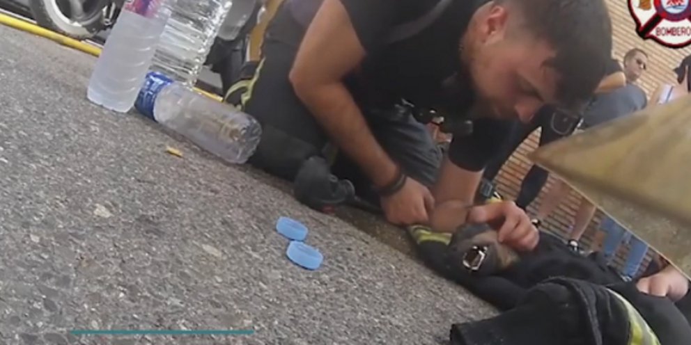Οπως φαίνεται στην ενσωματωμένη κάμερα που είχε πάνω του ο πυροσβέστης, ο ίδιος έβγαλε το μικρό σκυλάκι από το κτίριο και αμέσως του έκανε καρδιοπνευμονική αναζωογόνηση και το έλουσε με νερό προκειμένου να το κρατήσει στην ζωή.