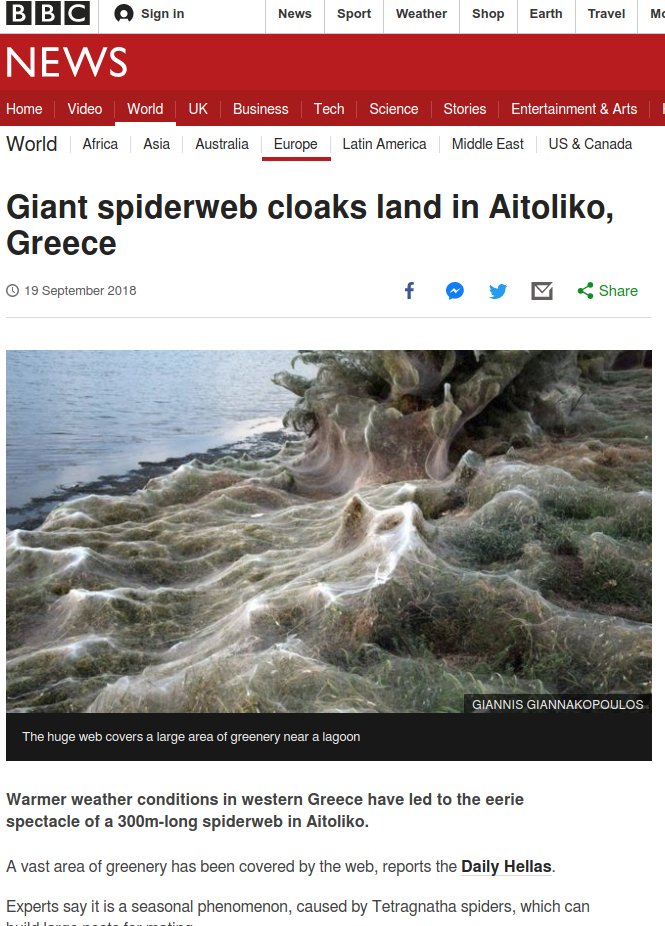 Εντωμεταξύ, οι εικόνες με τους ιστούς αράχνης να καλύπτουν τη βλάστηση στη λιμνοθάλασσα του Αιτωλικού έχουν γίνει viral και εκτός Ελλάδας με το θέμα να καλύπτεται και από το BBC.