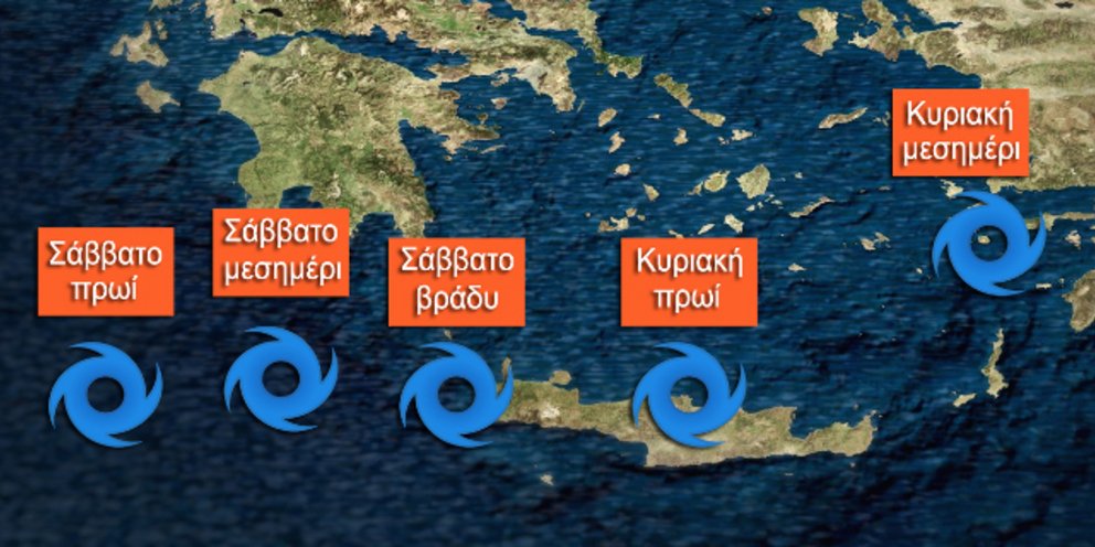 Οι άνεμοι θα είναι πολύ ισχυροί κυρίως στη νότια Ελλάδα κατά τη διάρκεια του περάσματος του Μεσογειακού κυκλώνα. Οι περιοχές που φαίνεται ότι θα έρθουν αντιμέτωπες με ισχυρές ριπές ανέμων μέσα στο ΣΚ (εντάσεις 10-11 μποφόρ) είναι τμήματα του νοτίου Ιονίου, της νότιας ενδεχομένως παράκτιας Πελοποννήσου, τοπικά της Κρήτης αλλά και των νότιων Δωδεκανήσων.