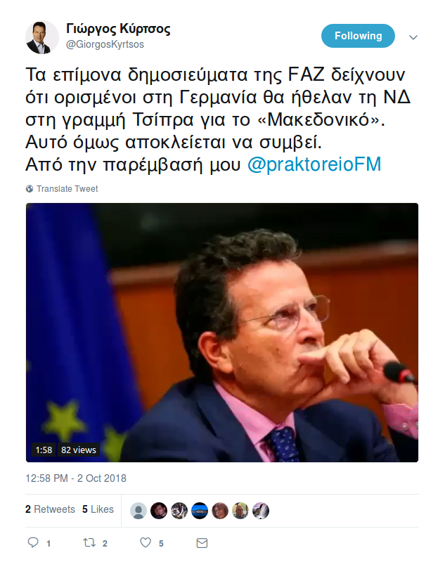 Αυτό του είπε και ο Τσίπρας, ενημερώνει ο Ζάεφ: «(Ο Τσίπρας) Δεν αναμένει ότι η Νέα Δημοκρατία θα είναι πλήρως εποικοδομητική, διότι ο Κυριάκος Μητσοτάκης θέλει να κερδίσει πόντους σε πολιτικό επίπεδο». Το γεγονός ότι ο Μητσοτάκης στην πραγματικότητα δεν ανήκει στους οπαδούς της σκληρής γραμμής και αναζητά τις συνομιλίες με τους «Μακεδόνες» αποδεικνύεται παρασκηνιακά. Όπως δηλώνει ο Ζάεφ, ο Μητσοτάκης του είχε στείλει ήδη από τον Δεκέμβριο του 2017 την έμπιστή του, ευρωβουλευτή Μαρία Σπυράκη, προκειμένου, μακριά από τα φώτα της δημοσιότητας, να του ανακοινώσει ποια είναι η θέση των Ελλήνων συντηρητικών για την επίλυση της «διαμάχης για την ονομασία».