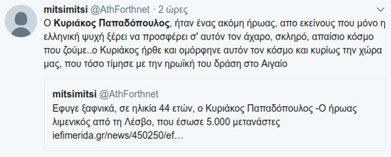 Οι Ελληνες θρηνούν στα κοινωνικά δίκτυα, για τον θάνατο του 44χρονου ήρωα υποπλοίαρχου του Λιμενικού Σώματος Κυριάκου Παπαδόπουλου, που έφυγε ξαφνικά από τη ζωή χθες, από ανακοπή καρδιάς.