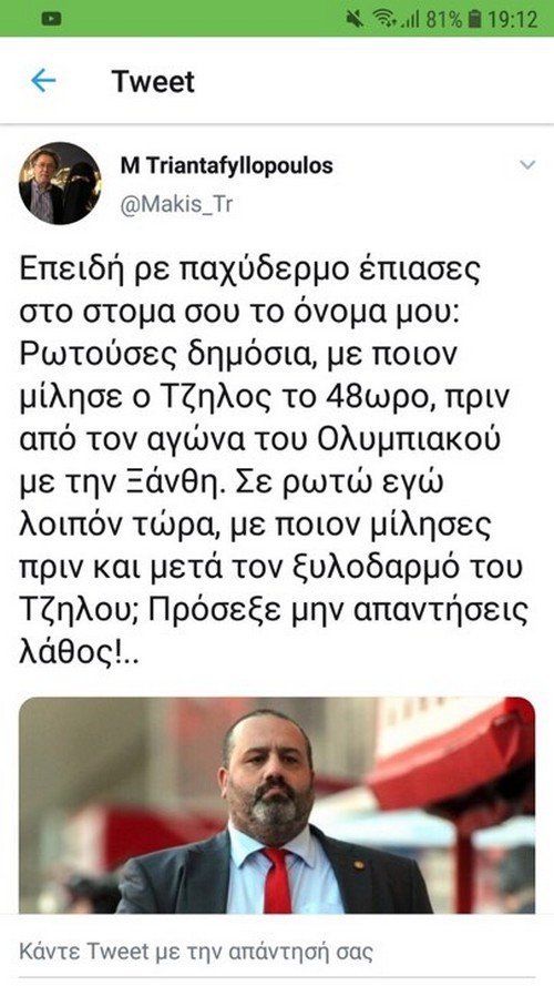 Ακολούθως ο Τριανταφυλλόπουλος με tweet του καταφέρεται ευθέως κατά του διευθυντή επικοινωνίας της ΠΑΕ Ολυμπιακός, Κώστα Καραπαπά για τον ξυλοδαρμό του διαιτητή.