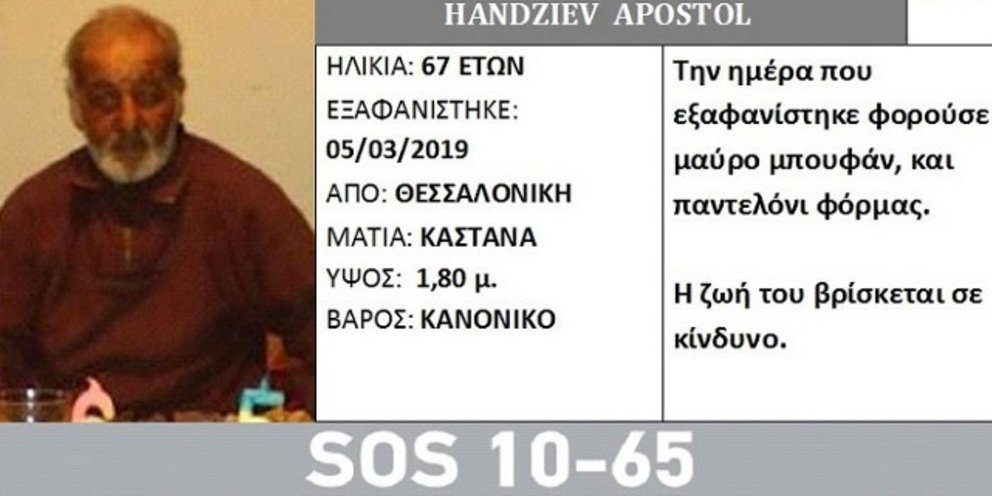 Αγνοείται από τις 5 Μαρτίου ο Handziev Apostol που εξαφανίστηκε από το νοσοκομείο «Παπανικολάου» στη Θεσσαλονίκη.
