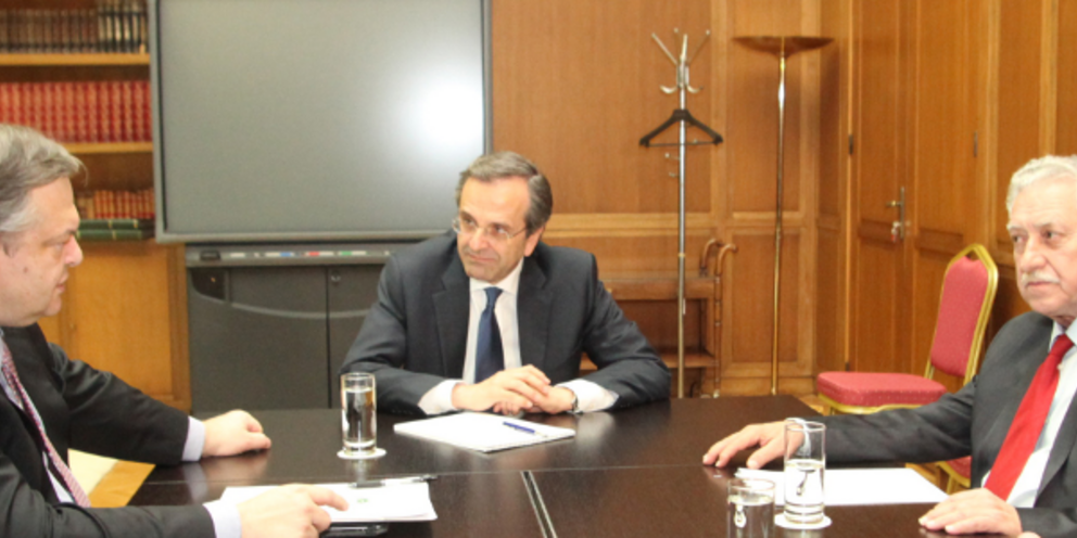 Στο γραφείο του πρωθυπουργού Αντώνη Σαμαρά στη Βουλή θα πραγματοποιηθεί στη μία το μεσημέρι η συνάντηση των πολιτικών αρχηγών που στηρίζουν την κυβέρνηση. Ο Αντώνης Σαμαράς θα οριστικοποιήσει τη σύνθεση της νέας κυβέρνησης από κοινού με τον Ευάγγελο Βενιζέλο και τον Φώτη Κουβέλη.