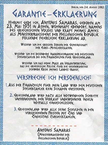 Τα γερμανικά μέσα ενημέρωσης που συνεχίζουν ακάθεκτα να προκαλούν με τα δημοσίευμα τους για την Ελλάδα σήμερα έβαλαν στο στόχαστρο τους τον Ελληνα πρωθυπουργό Αντώνη Σαμαρά. Η εφημερίδα Bild έφτιαξε μια εγγυητική επιστολή με αρχαιοελληνική γραμματοσειρά και βάζοντας ως πλαίσιο τον μαίανδρο και του ζητάει να την υπογράψει.